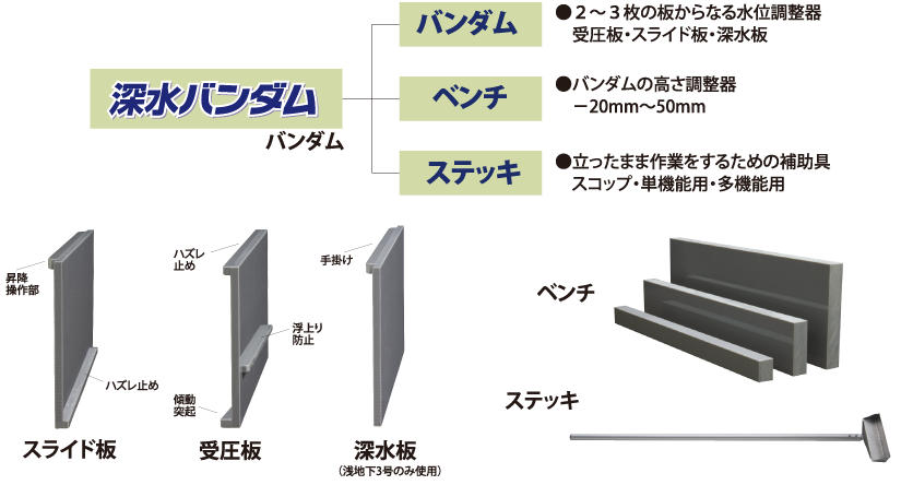 深水バンダムは水位調整器の総称で、バンダム・ベンチ・ステッキの3パーツから構成されています。